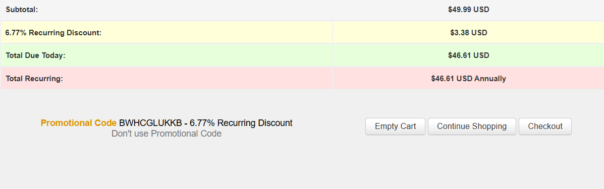 在将要购买的VPS主机加入购物车后,可看到输入优惠码的地方(Promotional Code),在后面的文本框输入优惠码,点击Validate Code >>验证优惠码,如果优惠码有效,会出现如下图界面,会表明折扣力度和是否循环折扣: