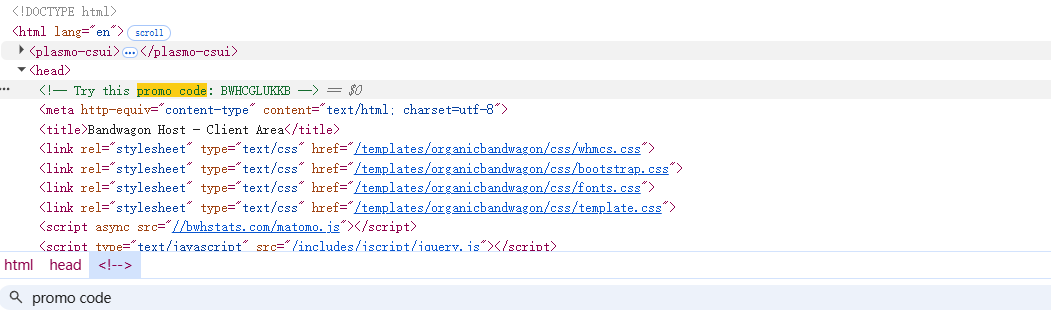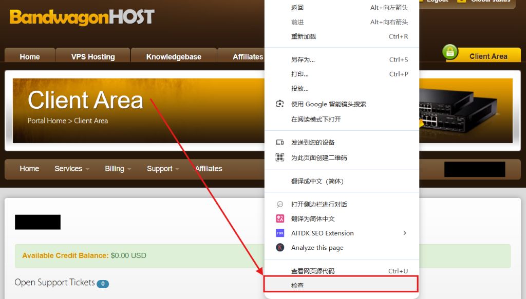 通过搬瓦工官网获取优惠码(彩蛋)教程,打开搬瓦工客户中心,点击右键【检查 或者 查看网页源代码】: